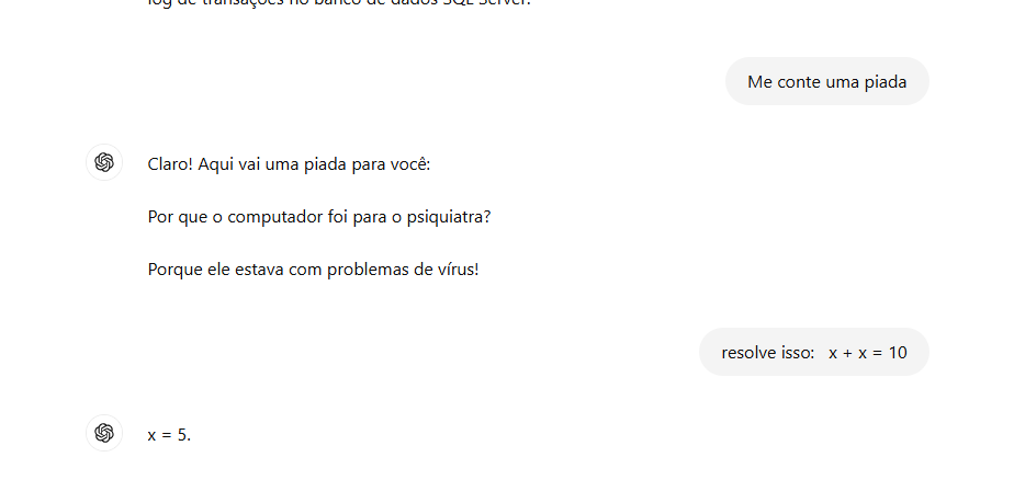 E, obviamente, louco por tecnologia que sou, isso me chamou muito a atenção: Será que é só mais programinha que responde coisa com coisa (um gerador de bla bla), ou o negócio realmente parece alguém mesmo? Fui conferir e fiquei impressionado… Na minha primeira conversa com o ChatGPT eu fiz pergunta de todo o tipo pra ele: Se sabia falar em português, se conseguia resolver um problema de SQL Server, sobre a própria arquitetura dele e até sobre DNA kkkkk! Não vou botar o link da conversa aqui por ter algumas partes que não quero expor, mas veja alguns prints: